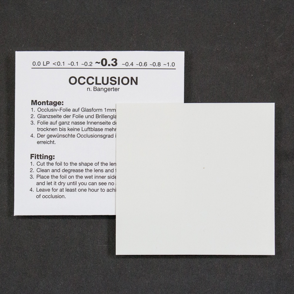 Bangerter okklusionsfolie, som kan med følgende slør: 20/20, 20/25, 20/30, 20/50, 20/70, 20/100, 20/200 & 20/300 og lysperception.