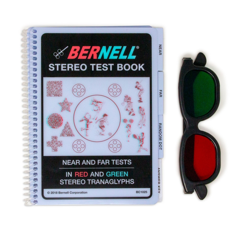 Bernell Stereo Test Book indeholder testsektioner for hhv. nær, afstand og random dot. Nærtest måler fra 1500 til 40 buesekunder i 3 faser. Afstandstesten måler fra 180 til 60 buesekunder og Random Dot Test måler fra 800 til 25 buesekunder. Produktet indeholder et par Bernell New Age røde/grønne beskyttelsesbriller. Produktguide og vejledning er trykt inde i bogen.