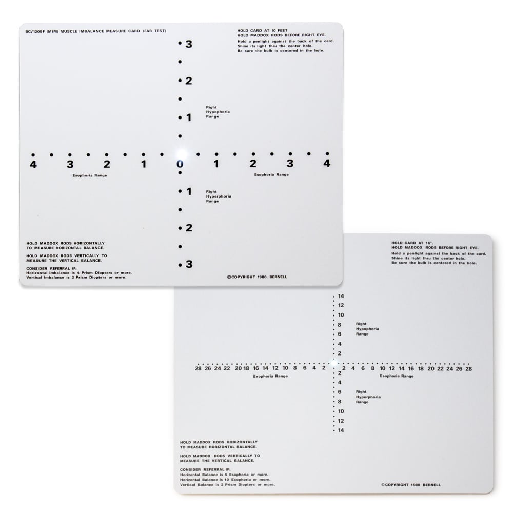 Fori kortene tester lodret og vandret muskelbalance for både nær og fjern testafstand. Brugt med Maddox Rod og Penlight. Testkortet måler 26,7 cm x 20,3 cm