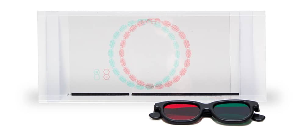 Ny 3D variabel Tranaglyph™. Kan sammenlignes med det populære Quoit Vectogram. Sættet er med et par rød/grøn briller og en holder (BC550)